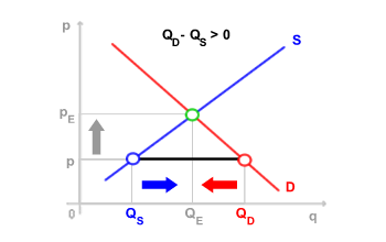 In un'economia di mercato l'eccesso di domanda positivo spinge al rialzo il prezzo ( p ) del bene, riducendo indirettamente la domanda QD(p) e aumentando l'offerta QS(p), fin quando il mercato non giunge a una situazione di equilibrio di mercato in qui QD(pE)=QS(PE). La rappresentazione sul diagramma cartesiano di un eccesso di domanda positivo è la seguente: