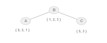 L'algoritmo di ricerca CSP ha l'obiettivo di trovare una combinazione di valori delle variabili ( A, B, C ) tale da restituire una somma A+B+C uguale a 5. Seguendo l'ordine di assegnazione delle variabili A⇒B⇒C, l'algoritmo di ricerca esegue 18 operazioni di assegnazione prima di giungere alla soluzione del problema. L'albero di ricerca è il seguente: