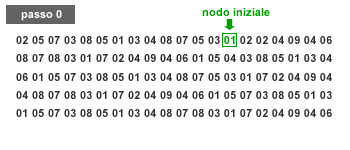 Massimo locale piatto. Un altro rischio dell'algoritmo hill climbing è quello di imbattersi in un massimo locale piatto. Quando tutti i nodi vicini hanno un valore uguale al nodo corrente l'algoritmo si blocca. Nel seguente esempio il nodo corrente non prosegue l'esplorazione dal nodo corrente ( valore 01 ) nonostante siano presenti almeno cinque cammini diversi per arrivare fino al massimo globale ( valore 09 ) a partire dai nodi vicini di pari valore.