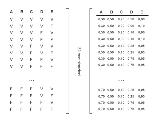 Come si può notare, sono necessarie 32 combinazioni ( righe ) per memorizzare tutti i possibili casi che possono verificarsi nel dominio di riferimento. Per ciascuna riga sono indicate le relative probabilità condizionate. Per accedere all'ultima combinazione della tabella ( F F F F F ) sono necessarie 32 operazioni di lettura dei record.