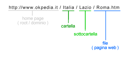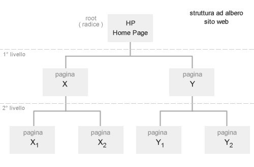 Nella struttura ad albero la pagina principale del sito, detta home page o pagina di accoglienza, occupa la parte più alta della struttura, ossia la radice ( root ) della struttura. L'home page è collegata alle pagine web secondarie del sito, le quali sono a loro volta collegate alle pagine di terza importanza. La struttura ad albero si sviluppa in profondità. Ogni pagina secondaria ( pagina di 2° livello ) è dedicata a un particolare argomento del sito. Le pagine di 3° livello sono, invece, dedicate ad approfondire un particolare dettaglio dell'argomento.