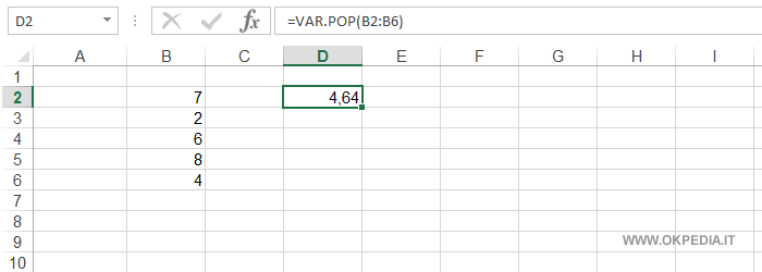 Per calcolare la varianza di una serie di valori nel foglio di calcolo Excel si utilizza la funzione VAR.POP.